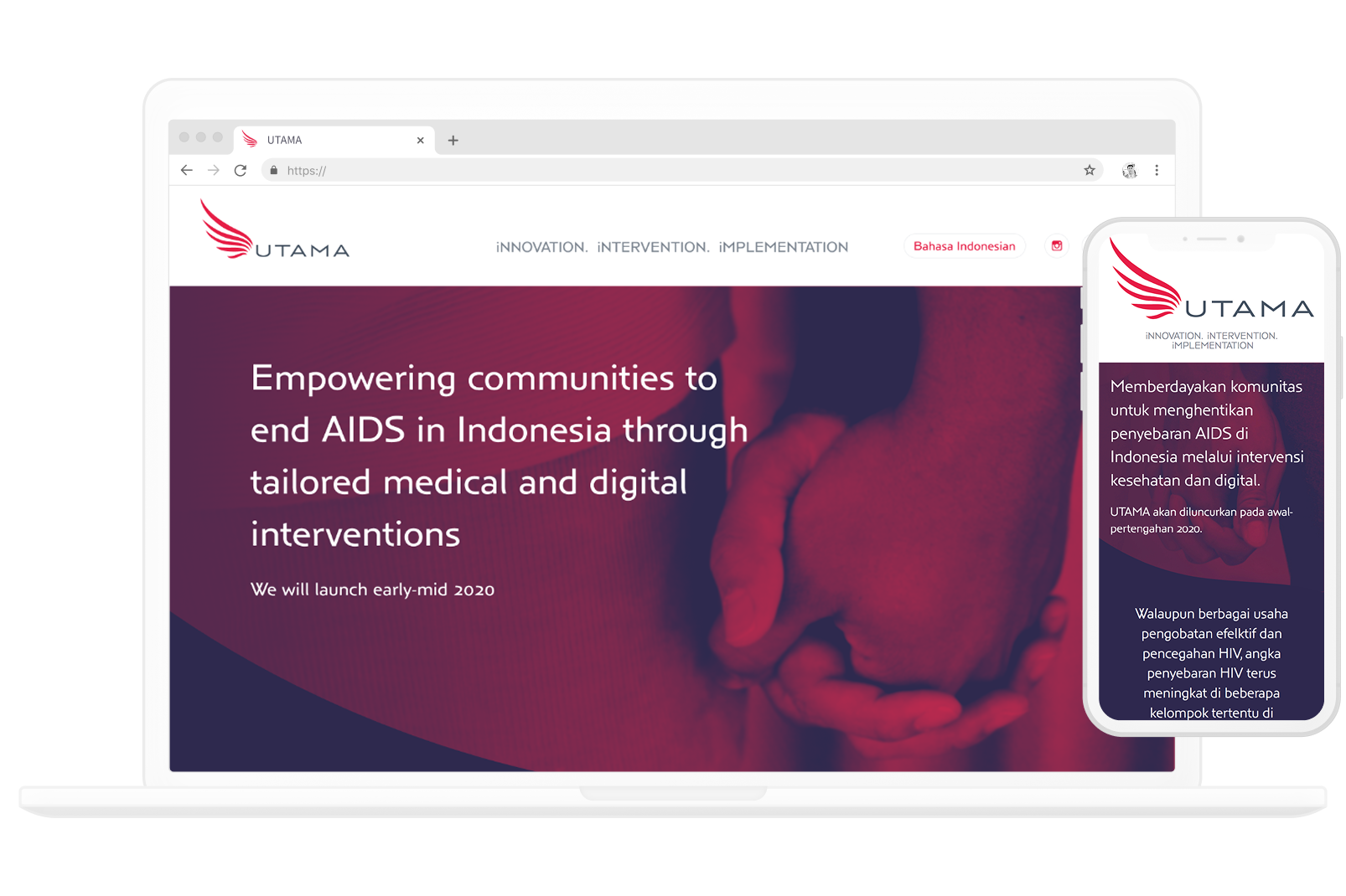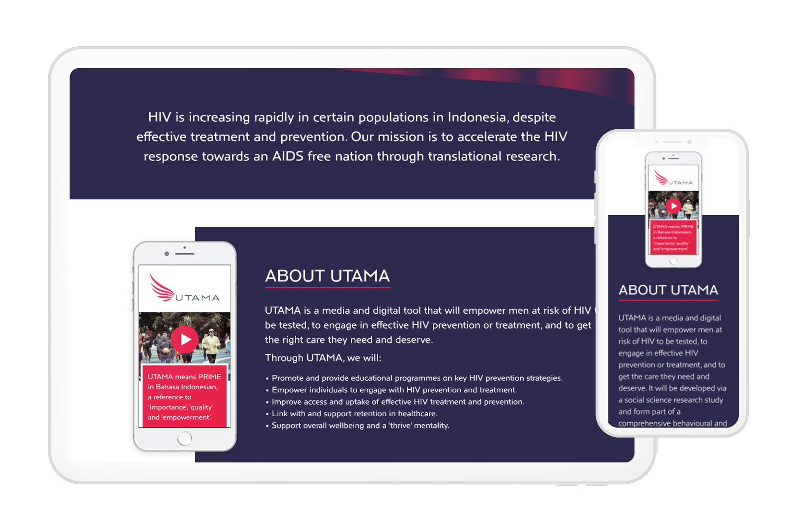I began by developing the logo and brand identity for UTAMA, informed by the idea of empowerment, the meaning of “utama” in Bahasa Indonesian. This led to a bold yet timeless colour palette, centred around a bright red commonly associated with the fight against AIDS, and a clean, classic logo designed to help reduce stigma.